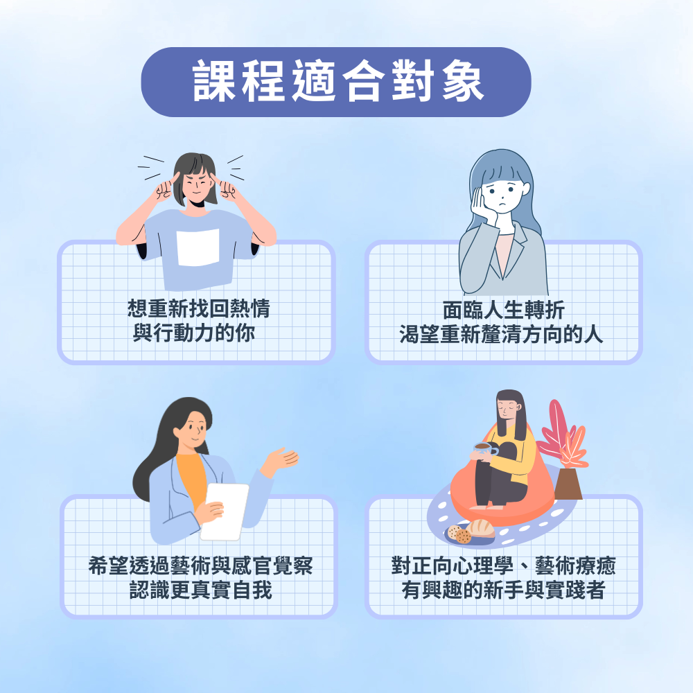 這不是單純的「計畫設計」或「美術課」,而是一場結合感官覺察、心理支持與具體行動方案的整合式自我探索課,帶你從感受、情緒、信念到行動層層對話與轉化。