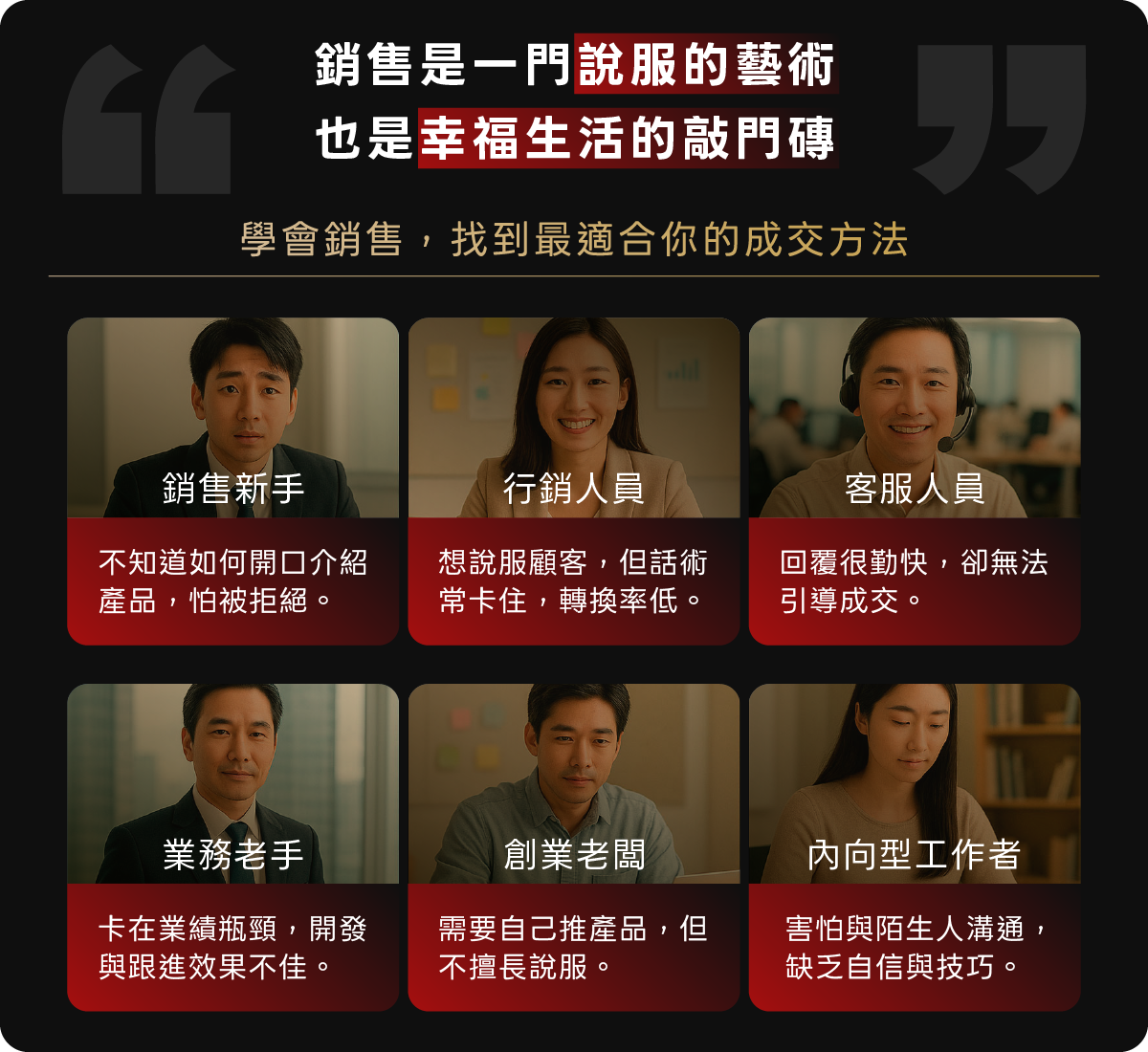 透過老師多年經驗與實戰案例,本課將帶你重新定義「拒絕」──建立正向思維與堅韌態度,把它視為成交的暖身,而非終點。你將學會如何成為客戶眼中的「安心對象」,讓拒絕不再是阻力,而是成交的前奏,並從中找到成長的力量,持續保持信心與動力。